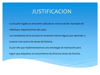 El documento propone usar Internet para motivar a los estudiantes de una escuela rural a aprender historia. El proyecto involucra actividades como búsquedas en Google sobre temas históricos, selección de fuentes virtuales, estudio de temas seleccionados y elaboración de talleres en Word. Se espera que esto desarrolle el interés por la historia, las habilidades de redacción y el uso de las TIC como herramientas educativas.