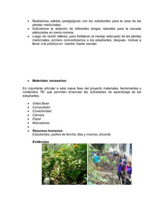 Este proyecto busca fortalecer el conocimiento de plantas medicinales entre estudiantes de primer grado en la escuela Juan de Dios Los Bujios a través de prácticas educativas innovadoras y el uso de herramientas TIC. Se justifica por la importancia de preservar los saberes ancestrales sobre plantas medicinales transmitidos de generación en generación en la comunidad Guambiana. Las actividades incluyen investigar plantas medicinales con ancianos locales, visitas a jardines de plantas, y cultivo de una huerta escolar con espec