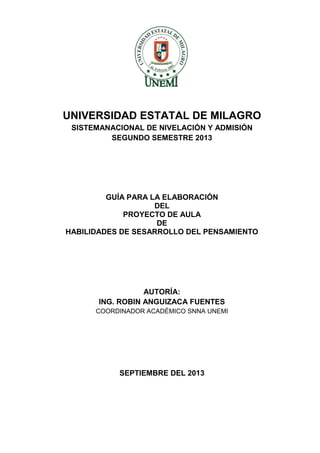 UNIVERSIDAD ESTATAL DEMILAGRO SISTEMANACIONAL DE NIVELACIÓN Y ADMISIÓN SEGUNDO SEMESTRE 2013 GUÍA PARA LA ELABORACIÓN DEL PROYECTO DE AULA DE HABILIDADES DE SESARROLLO DEL PENSAMIENTO AUTORÍA: ING. ROBIN ANGUIZACA FUENTES COORDINADOR ACADÉMICO SNNA UNEMI SEPTIEMBRE DEL 2013