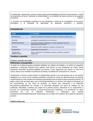 Este proyecto busca promover el uso de las TIC en la comunidad educativa de Casa Blanca a través del proyecto pedagógico de la huerta escolar. El proyecto tiene como objetivo principal fomentar una cultura digital que facilite el desarrollo de competencias en los estudiantes. Se implementarán herramientas TIC como computadores, cámaras y redes sociales para sistematizar el proyecto de la huerta, investigar procesos de producción y divulgar experiencias. El proyecto se desarrollará a lo larg