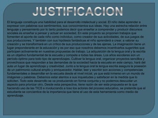 Este documento describe la importancia de desarrollar las habilidades de lenguaje y comunicación en los niños a través de actividades pedagógicas que fomenten la expresión oral, la creatividad y el pensamiento crítico. Propone implementar proyectos que involucren a los estudiantes de manera activa y desarrollen su capacidad de lectura, escritura y uso de las TIC. El objetivo es fortalecer estas competencias desde una perspectiva de aprendizaje significativo.
