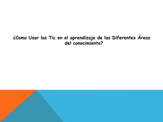 Este documento propone el uso de las TIC para mejorar el aprendizaje en diferentes áreas del conocimiento en la educación primaria. Los objetivos son mejorar el aprendizaje de los estudiantes mediante las TIC, enseñar el uso de programas de office e Internet, y diseñar un aplicativo didáctico para las diferentes áreas. Se justifica que las TIC motivarán a los niños y les permitirán familiarizarse con la tecnología de una manera progresiva y adecuada a cada edad para apoyar el aprendizaje en lengu