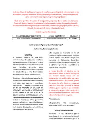 Este proyecto de aula busca introducir el uso de las tecnologías de la información y la comunicación (TIC) en la enseñanza de la química, específicamente en el tema de estequiometría, dado la dificultad que esta temática presenta para los estudiantes. Se propone la creación de ambientes virtuales de aprendizaje como un blog y un objeto virtual de aprendizaje (OVA) que incluya videos, material didáctico y módulos interactivos sobre estequiometría. Este proyecto se des