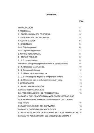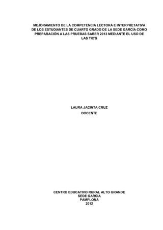 El proyecto busca mejorar la competencia lectora e interpretativa de los estudiantes de cuarto grado en la sede García, utilizando TIC como preparación para las pruebas Saber 2013. Se plantea un enfoque constructivista, donde se seleccionará literatura adecuada y se desarrollará un banco de lecturas y preguntas para fortalecer las habilidades lectoras. La metodología incluye varias fases, desde la sensibilización hasta la capacitación docente, con un compromiso continuo de las partes involucradas en la implementación del proyecto.