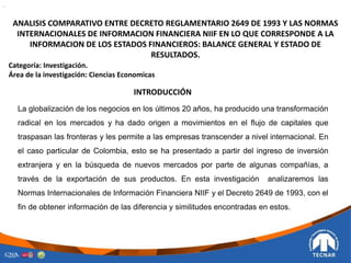 El documento presenta un análisis comparativo entre el Decreto Reglamentario 2649 de 1993 y las Normas Internacionales de Información Financiera (NIIF) en lo que respecta a la presentación de los estados financieros de balance general y estado de resultados. Se analizan las diferencias y similitudes entre ambos marcos normativos en términos de la información requerida en los estados financieros. El documento concluye que a pesar de algunas diferencias en la terminología, los principios subyacentes son similares entre las dos normativas