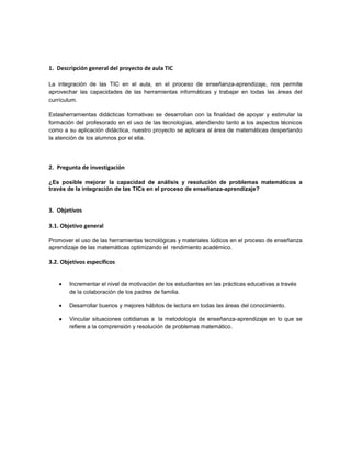 Este documento describe un proyecto para mejorar la enseñanza y el aprendizaje de las matemáticas mediante la integración de las TIC. El proyecto busca aumentar la motivación de los estudiantes y su capacidad de análisis y resolución de problemas a través del uso de herramientas tecnológicas y materiales lúdicos. Los objetivos incluyen promover el uso de estas herramientas para optimizar el rendimiento académico, incrementar la motivación de los estudiantes y desarrollar buenos hábitos