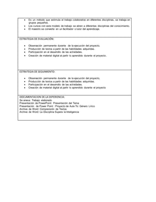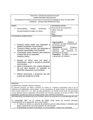 Este documento presenta un proyecto de aula enfocado en fomentar las habilidades comunicativas de los estudiantes de tercer grado a través del uso de herramientas tecnológicas. El proyecto busca mejorar las deficiencias encontradas en habilidades como la lectura, escritura, expresión oral y escucha activa. Se implementarán actividades pedagógicas utilizando presentaciones en PowerPoint, videos, Word y blogs para despertar el interés de los estudiantes y fortalecer sus habilidades comunicativas.