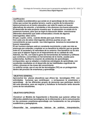 Este proyecto busca mejorar la enseñanza y el aprendizaje en un centro educativo rural mediante el uso de las tecnologías de la información y la comunicación (TIC). Actualmente, los estudiantes de este centro tienen dificultades en materias como matemáticas, español e informática. El proyecto capacitará a los docentes en el uso pedagógico de las TIC y desarrollará habilidades de investigación en los estudiantes para superar los déficits actuales. Se integrarán herramientas TIC como blogs, wik