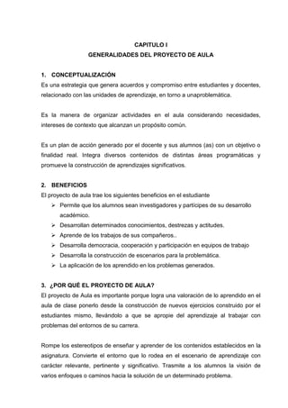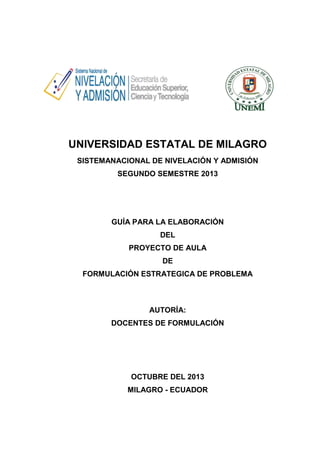 Este documento proporciona una guía para la elaboración de proyectos de aula en la Universidad Estatal de Milagro. Explica que un proyecto de aula es una estrategia que genera acuerdos entre estudiantes y profesores para abordar problemas relacionados con las unidades de aprendizaje. Detalla los beneficios de los proyectos de aula para los estudiantes y por qué son importantes. Además, establece los pasos para la construcción de un proyecto de aula, incluida la recopilación de información