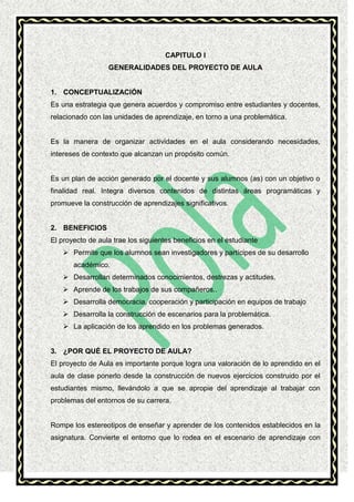 Este documento presenta una guía para la elaboración de proyectos de aula en la Universidad Estatal de Milagro. Explica que los proyectos de aula permiten integrar diversos contenidos de diferentes áreas y promueven aprendizajes significativos. Describe el proceso de construcción de un proyecto de aula, incluyendo la recopilación de información, el desarrollo de diferentes capítulos, y la estructura del informe final. El objetivo es que los estudiantes apliquen los conocimientos adquiridos en