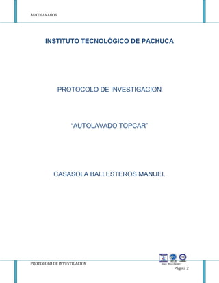 Este documento presenta un protocolo de investigación para un sistema de filtración de agua secuencial en un autolavado. El objetivo es recuperar hasta el 85% del agua utilizada mediante separación y filtración para eliminar contaminantes. El proceso de lavado de autos consume mucha agua y jabón, por lo que la investigación busca métodos para reducir costos y tiempos de lavado mientras se brinda un buen servicio.