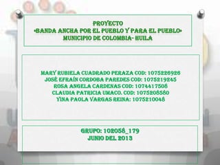 El documento propone crear una empresa de internet de banda ancha en el municipio de Colombia Huila, debido a que actualmente el servicio es deficiente. El proyecto beneficiaría a la población al mejorar el acceso a la tecnología y permitir el desarrollo educativo y económico de la región. Se presenta un análisis técnico y financiero para justificar la viabilidad e impacto positivo del proyecto.