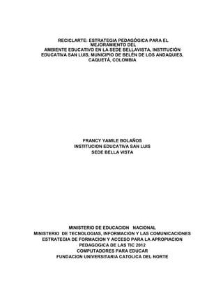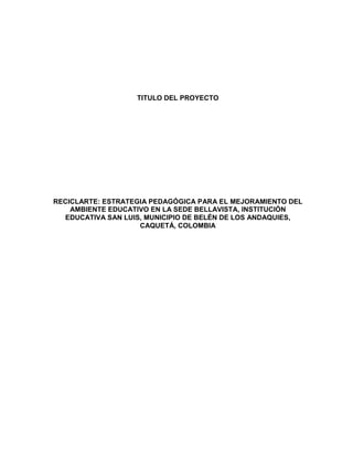 Este documento presenta un proyecto pedagógico llamado "Reciclarte" para mejorar el ambiente educativo en la sede Bellavista de la Institución Educativa San Luis en Colombia. El proyecto busca desarrollar conocimientos sobre reciclaje y medio ambiente en los estudiantes, y promover el reciclaje de basura a través de actividades artísticas para reducir la contaminación. El proyecto se enfoca en las áreas de ciencias naturales y artística, y utiliza estrategias como la siembra de una hu