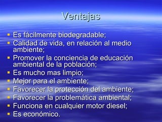 Este documento describe un proyecto para producir biodiesel a partir de aceite vegetal usado mediante una encuesta y una planta de biodiesel. La encuesta encontró que la gente estaría dispuesta a donar 1,250 litros de aceite vegetal usado por semana y apoyar el proyecto. La planta requeriría equipos como tanques, bombas, filtros y un costo aproximado de $33,100. El biodiesel producido se destinaría para los transportes escolares para reducir costos y contaminación.