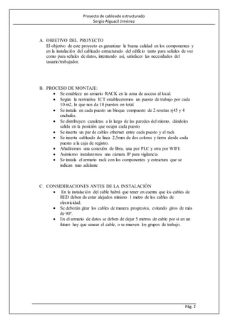 El documento describe un proyecto de cableado estructurado para una oficina de 100m2 que incluye 10 puestos de trabajo. Se instalará un armario de red con switch, paneles de parcheo y otros componentes, así como cableado estructurado categoría 5e en cada puesto con rosetas dobles y tomas de corriente. El presupuesto total es de 3.280 euros.