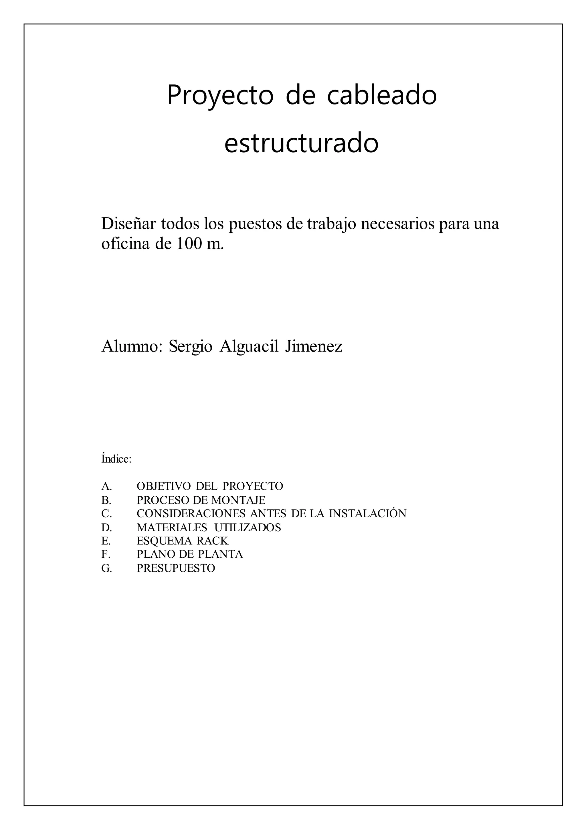 El documento describe un proyecto de cableado estructurado para una oficina de 100m2 que incluye 10 puestos de trabajo. Se instalará un armario de red con switch, paneles de parcheo y otros componentes, así como cableado estructurado categoría 5e en cada puesto con rosetas dobles y tomas de corriente. El presupuesto total es de 3.280 euros.
