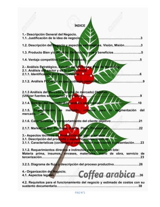 Este documento presenta el plan de negocios de la empresa "Like Coffee S.A.", la cual se dedicará a la producción y comercialización de café descafeinado molido. Describe la justificación del proyecto, visión, misión y valores de la empresa. Asimismo, detalla las características del producto, análisis de la competencia, plan de marketing, procesos productivos, estructura organizacional, proyecciones financieras y presupuestos operativos y financieros para un periodo de un año. El objetivo es posicionar la marca