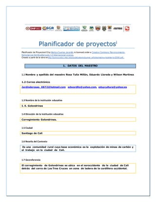 Este documento presenta un proyecto educativo para recuperar una zona verde en una institución educativa rural en Colombia. El proyecto involucra a los estudiantes del grado 10 en la siembra de grama y plantas ornamentales en un área de 12 metros cuadrados frente a un bloque de salones. El proyecto busca mejorar el ambiente escolar y desarrollar valores como la responsabilidad y la conciencia ambiental en los estudiantes a través de actividades prácticas y el uso de las TIC. El progreso del proyecto será