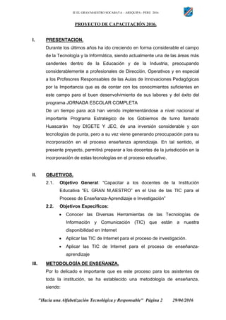 El documento describe un proyecto de capacitación y alfabetización docente en tecnología, impulsado por la institución educativa 'El Gran Maestro' en Arequipa, Perú. Su objetivo es capacitar a los docentes en el uso de TIC para mejorar el proceso de enseñanza-aprendizaje, garantizando la participación activa y la aplicación práctica. El proyecto incluye talleres, asesorías, un cronograma de actividades, y un enfoque en la enseñanza de herramientas tecnológicas relevantes.