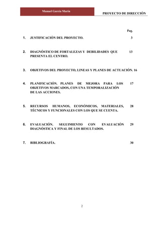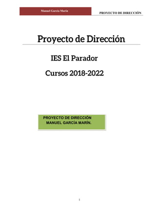 Este proyecto de dirección presenta la justificación, objetivos y planes de actuación para el IES El Parador. Presenta al nuevo equipo directivo y su visión para continuar mejorando la calidad educativa a través de estrategias como fomentar las competencias clave, las metodologías activas, la atención a la diversidad y la mejora continua. El proyecto también analiza el contexto del centro y la comunidad para adecuar sus objetivos a las necesidades detectadas.