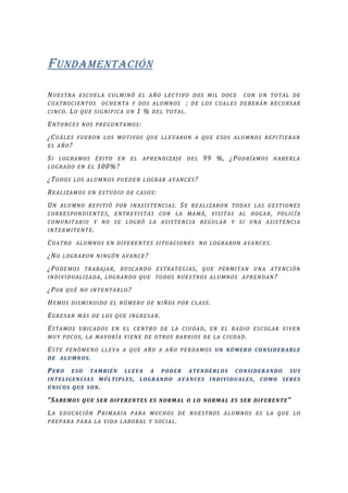 Este documento discute las estrategias que una escuela está implementando para reducir la repetición y deserción escolar. La escuela busca atender a la diversidad de los estudiantes y lograr avances individuales mediante nuevos formatos organizativos, como dedicar a los docentes a áreas específicas y trabajar en forma vertical y horizontal. También busca involucrar más a las familias y trabajar en estrategias para mejorar la asistencia regular a clases.