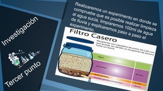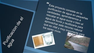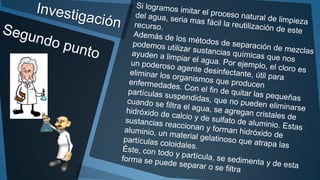 Este documento presenta un método sencillo para limpiar y reutilizar el agua mediante un proceso de filtración. El proceso implica agregar arena, sulfato de aluminio y cloro a agua sucia, agitar la mezcla, dejarla reposar y filtrarla. Esto permite limpiar el agua de manera efectiva para su reutilización.