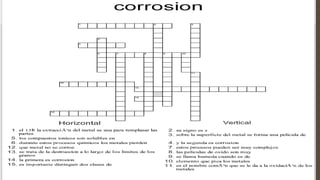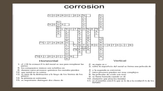 La corrosión es el proceso de oxidación de los materiales metálicos. Representa una carga económica significativa para los países. Puede evitarse protegiendo los metales o combinándolos con otros como el aluminio que se oxida más lentamente. La corrosión puede ser uniforme, localizada o intercristalina.