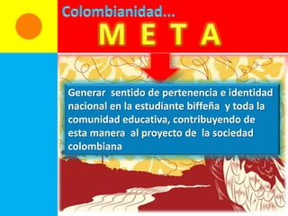 El documento describe el proyecto de Colombianidad del Colegio Biffi, el cual tiene como meta generar sentido de pertenencia e identidad nacional. En 2010, el proyecto incluyó actividades para conmemorar el Bicentenario de la Independencia de Colombia, como discusiones sobre la independencia, murales, y socio-dramas sobre los héroes de la independencia. El documento también describe las rutas del Bicentenario, incluyendo la Ruta de los Comuneros y la Ruta Mutis.