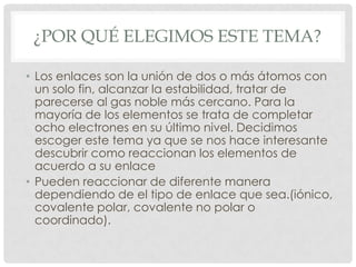 Este documento presenta un proyecto escolar sobre los tipos de enlaces químicos realizado por un grupo de 5 estudiantes para su clase de Química. El proyecto explora los diferentes tipos de enlaces (iónico, covalente polar, covalente no polar y coordinado) y cómo reaccionan los elementos de acuerdo a su enlace. El grupo explica por qué eligieron este tema y enumera algunas fuentes donde se puede encontrar más información sobre los enlaces químicos. Cada integrante comparte cuál de los programas vist