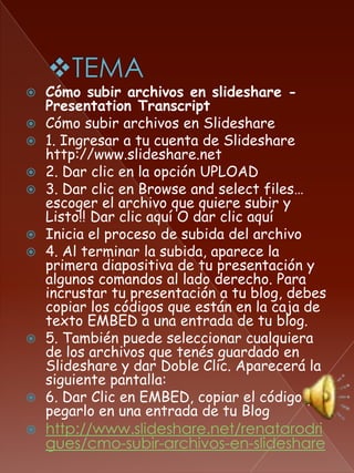 Este documento proporciona instrucciones en 6 pasos para subir archivos a Slideshare. Los pasos incluyen iniciar sesión en Slideshare, hacer clic en "Subir", seleccionar el archivo, esperar a que se complete la carga, copiar el código de incorporación y pegarlo en un blog.