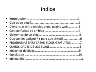 Este documento proporciona una introducción a los blogs. Explica que un blog es un sitio web actualizado periódicamente que recopila artículos de uno o más autores en orden cronológico inverso. También describe algunas características clave de los blogs como la frecuencia de actualización, la colaboración y la facilidad para agregar contenido. Además, cubre elementos comunes como comentarios, enlaces, fotografías y programas gratuitos para crear blogs.