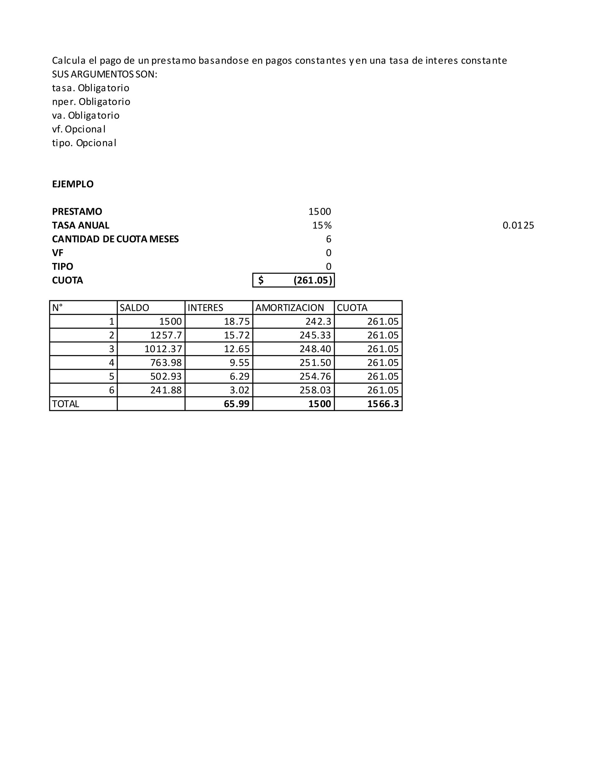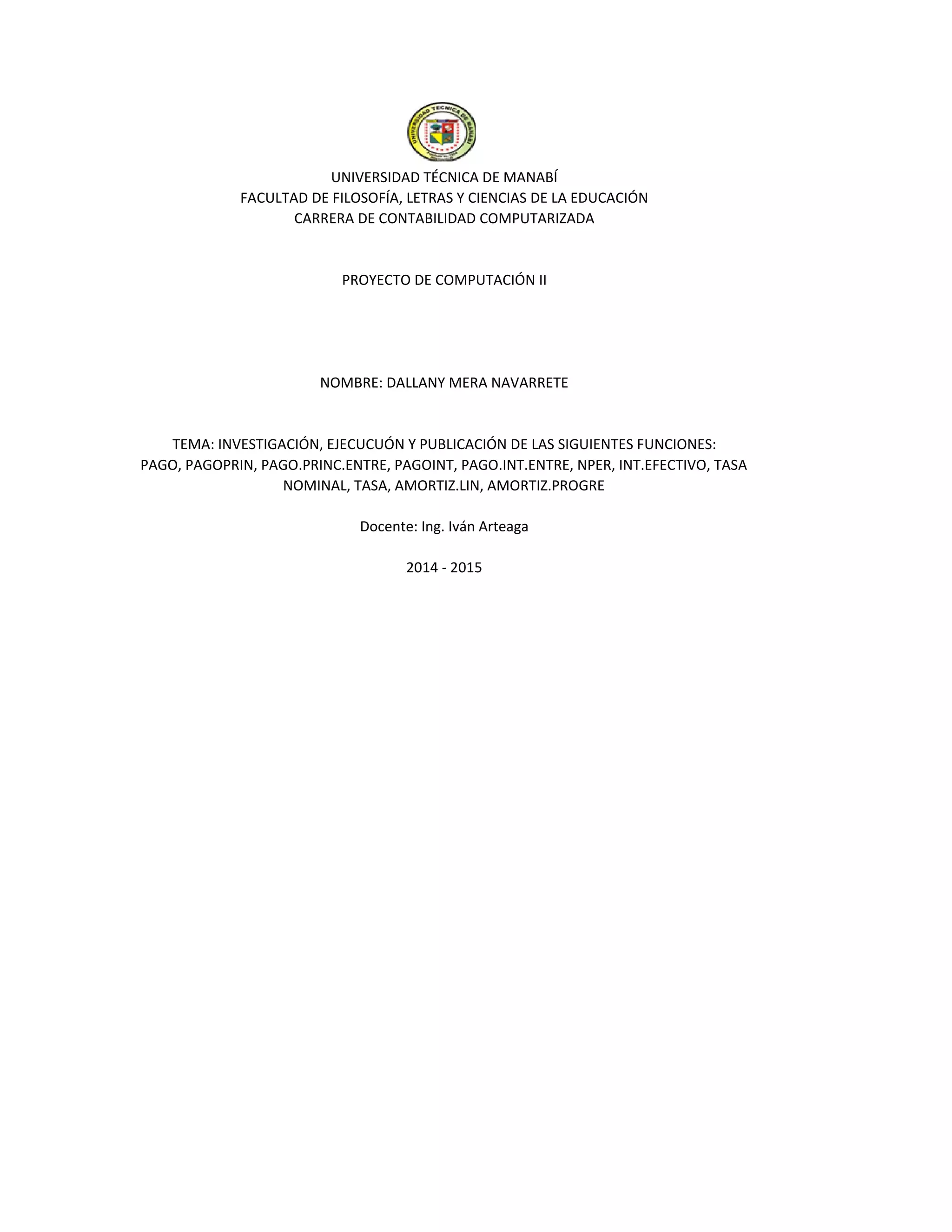 Este documento presenta siete funciones de computación relacionadas con cálculos financieros: 1) cálculo de pagos de préstamos con tasas de interés y pagos periódicos constantes, 2) cálculo de pagos de inversión, 3) cálculo de capital pagado entre períodos, 4) cálculo de interés pagado entre períodos, 5) cálculo de períodos de una inversión, 6) cálculo de tasas de interés efectivas y nominales, y 7) cálculo de amortización lineal y progresiva para