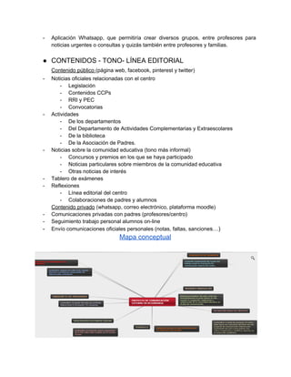 Este documento presenta un plan de comunicación exterior para un centro de enseñanza secundaria con el objetivo de favorecer la comunicación entre los miembros de la comunidad educativa y dar publicidad al centro. El plan propone utilizar la página web del centro, blogs, aulas virtuales, redes sociales y WhatsApp para compartir información, y designa al responsable TIC para coordinar la implementación con la participación de profesores, alumnos y familias.