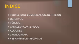 Este documento presenta un proyecto de comunicación para un centro educativo. El proyecto define la comunicación interna y externa, establece objetivos como mejorar la comunicación y definir la identidad del centro, identifica los públicos clave, propone canales como la página web y redes sociales, y presenta acciones, cronograma y responsables para llevar a cabo el plan de comunicación.