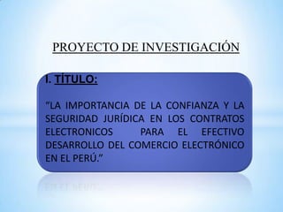 El documento describe una investigación sobre la importancia de la confianza y la seguridad jurídica en los contratos electrónicos para el desarrollo del comercio electrónico en Perú. Explica que la confianza y la seguridad son fundamentales para que los usuarios y empresas celebren contratos electrónicos. Sin embargo, las normas actuales no son suficientes para garantizar esta confianza y seguridad. Se necesitan nuevas normas que respalden mejor la veracidad, transparencia y seguridad de los contratos electrónicos para que el comercio electr