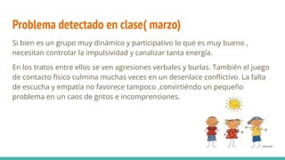 Este documento describe un proyecto para mejorar la convivencia en un salón de clases. Se proponen diversas actividades como juegos, talleres y discusiones para que los estudiantes aprendan a controlar sus emociones, resolver conflictos de manera pacífica, y respetar las diferencias. También incluye trabajar con las familias para generar un ambiente de cooperación. El objetivo general es enseñar normas de respeto, solidaridad y participación democrática.