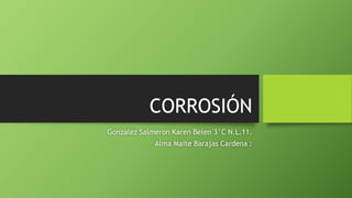 La corrosión es el deterioro de los metales debido a reacciones químicas con el medio ambiente. Afecta componentes como las turbinas de aviones, por lo que se han desarrollado recubrimientos protectores a base de materiales nanoestructurados. Existen diversos métodos para controlar la corrosión como alterar el ambiente, protección eléctrica, barreras intermedias y recubrimientos inorgánicos y orgánicos. Experimentos muestran procesos como la oxidación acelerada de la lana de acero y la protección del
