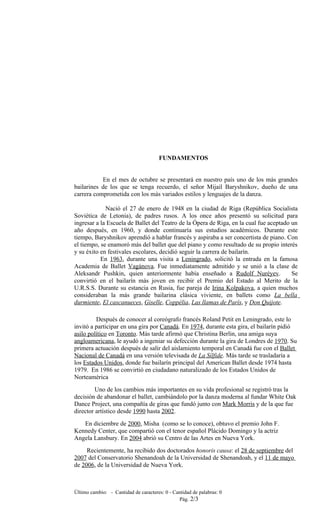El documento propone declarar al bailarín y actor Mijail Baryshnikov como Huésped de Honor de la Ciudad Autónoma de Buenos Aires durante su visita en octubre. Baryshnikov nació en 1948 en la Unión Soviética y se convirtió en uno de los bailarines más grandes del siglo XX. Defectó a Canadá en 1974 durante una gira y luego se mudó a los Estados Unidos, donde bailó con el American Ballet Theatre y se convirtió en ciudadano estadounidense en 1986. Actualmente es reconocido mundialmente por su té