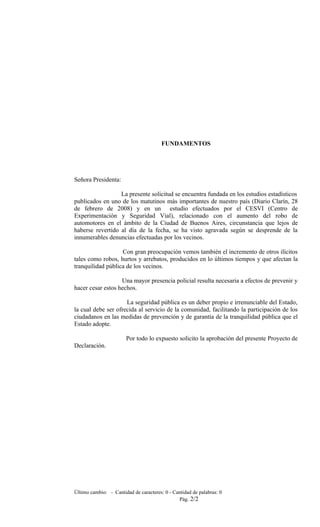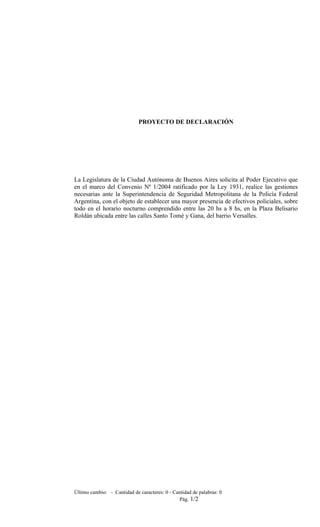 La Legislatura de la Ciudad de Buenos Aires solicita al Poder Ejecutivo que realice gestiones ante la Superintendencia de Seguridad Metropolitana de la Policía Federal Argentina para establecer una mayor presencia policial en la Plaza Belisario Roldán, entre las 20 hs y 8 hs, debido al aumento de robos de autos y otros delitos en ese horario y lugar, según estudios estadísticos, para prevenir ilícitos y garantizar la tranquilidad pública.