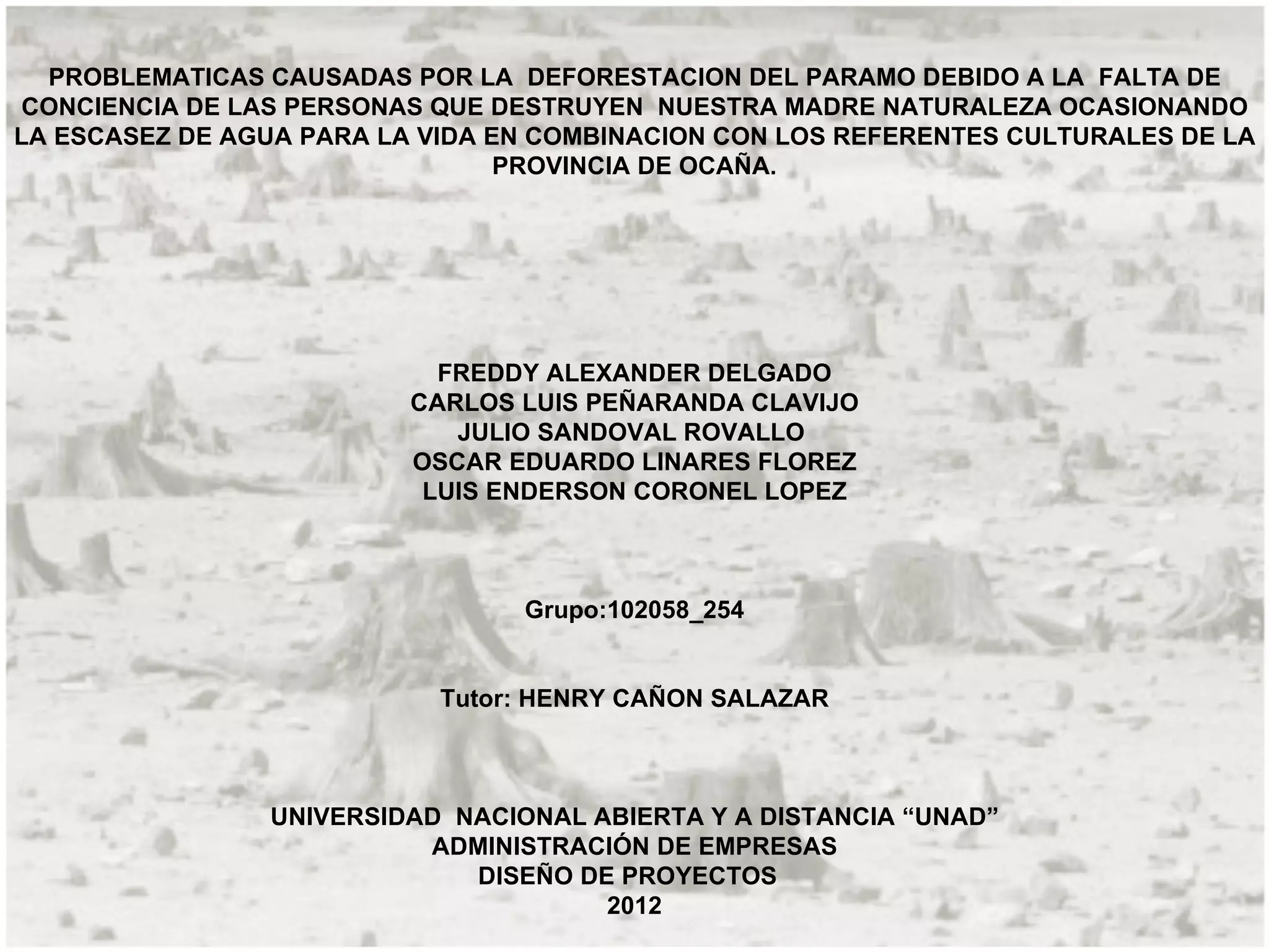 El documento habla sobre los problemas causados por la deforestación del páramo en la provincia de Ocaña, debido a la falta de conciencia ambiental de las personas que destruyen la naturaleza y ocasionan la escasez de agua para la vida en la provincia, en combinación con los referentes culturales de la zona.
