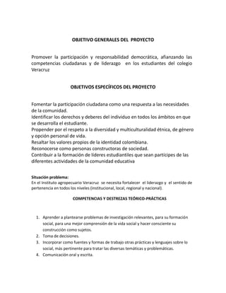 Este documento presenta un proyecto de democracia para el Instituto Agropecuario Veracruz en Colombia. El proyecto busca promover la participación y el liderazgo democrático entre los estudiantes a través de actividades como la elección de representantes estudiantiles, talleres sobre valores cívicos y símbolos nacionales, y eventos conmemorativos. El proyecto se implementará en varios grados con temas apropiados para cada nivel y será evaluado de forma continua.