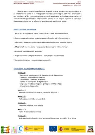Este documento describe un programa de formación dirigido a mujeres en el medio rural para facilitar su incorporación al mundo laboral. El programa enseñará habilidades digitales como digitalización de documentos y ofrecerá orientación profesional. Se llevará a cabo en noviembre de 2012 en Santibáñez de la Sierra, Salamanca.
