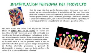 Este proyecto de dirección propone mejorar la calidad educativa de un centro escolar mediante cinco objetivos: 1) unificar y clarificar las actuaciones docentes, 2) integrar la evaluación de forma unificada, 3) ampliar recursos para mejorar el aprendizaje, 4) afianzar la imagen del centro como referente de calidad, y 5) estandarizar el proceso de autoevaluación. Se detallan las acciones, responsables e indicadores para cada objetivo.