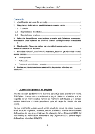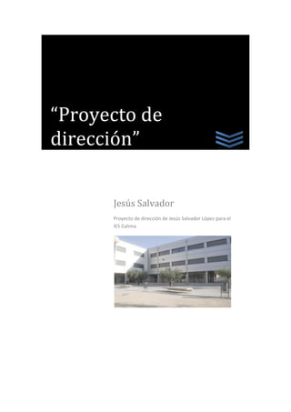 El documento presenta un proyecto de dirección para el IES Calima, liderado por Jesús Salvador López, que busca abordar las debilidades y fortalecer las oportunidades del centro educativo tras la renuncia del anterior director. Incluye un diagnóstico del contexto y análisis de los recursos disponibles, así como planes para establecer un plan de convivencia y ampliar la oferta educativa a una línea trilingüe. Su objetivo final es convertir el centro en un referente pedagógico en la región, promoviendo la igualdad de oportunidades y la colaboración con las familias y la comunidad.