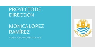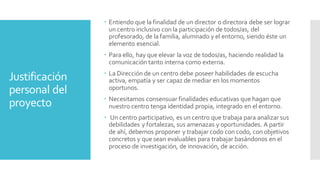 Este documento presenta un proyecto de dirección de un centro educativo. Se justifica la necesidad de lograr un centro inclusivo con participación de toda la comunidad educativa. Se analizan las fortalezas y debilidades del centro, y se proponen objetivos generales y planes de mejora en diversos ámbitos, como la comunicación, el proceso de enseñanza-aprendizaje, la atención a la diversidad y la convivencia. El proyecto busca actualizar los documentos del centro y fomentar la participación a través de distint