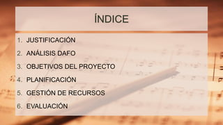 El documento presenta un proyecto de dirección para el CEM Ana Cárdenas en Antequera, Málaga. La directora, María Dolores López González, busca ofrecer una educación musical integral y accesible, promoviendo la excelencia, innovación, inclusión y compromiso comunitario. Su plan incluye mejorar la comunicación, excelencia académica, innovación pedagógica, vínculos comunitarios y desarrollo estudiantil a través de objetivos específicos y una planificación en fases de evaluación, implementación y se