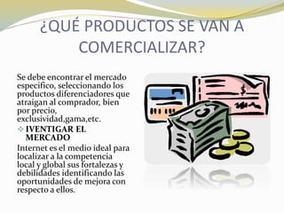 Este documento proporciona consejos sobre cómo establecer y administrar con éxito una tienda de comercio electrónico. Recomienda definir el cliente objetivo, investigar el mercado y la competencia, optimizar el sitio web para las ventas antes de conseguir tráfico, y desarrollar estrategias a largo plazo como presupuestos de marketing. También enfatiza la importancia de comprender el proceso de compra del cliente y centrarse en la venta sobre el diseño.