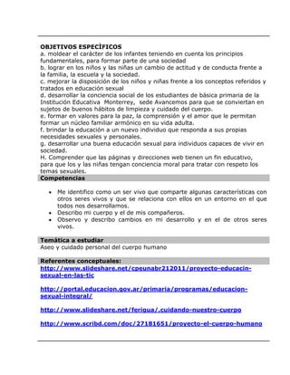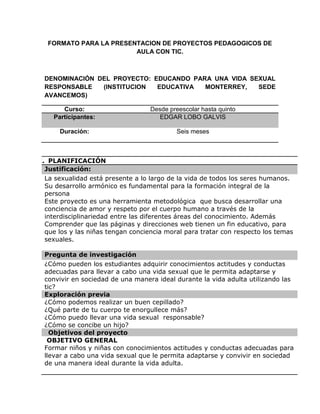 El proyecto 'Educando para una vida sexual responsable' busca formar a niños y niñas desde preescolar hasta quinto grado en la institución educativa Monterrey, mediante el desarrollo de conocimientos y actitudes adecuadas sobre la sexualidad a través de TIC. La metodología se enfoca en la afectividad y el aprendizaje activo, utilizando recursos didácticos como videos y actividades prácticas para concienciar sobre el cuidado personal y la sexualidad responsable. Además, incluye evaluaciones y un cronograma para medir el impacto del proyecto en la comunidad.