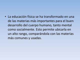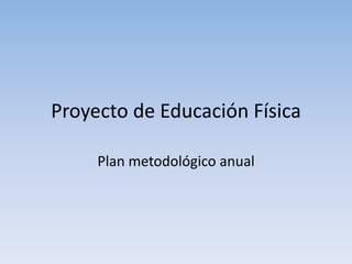 El documento presenta un plan metodológico anual para el proyecto de educación física. Su objetivo principal es promover la educación física para contribuir al desarrollo físico, mental y social de los estudiantes a través de actividades lúdicas y competitivas. Propone mejorar los contenidos y métodos de educación física de acuerdo con los cambios en el sistema educativo para mejorar la calidad de vida y educación de los estudiantes.