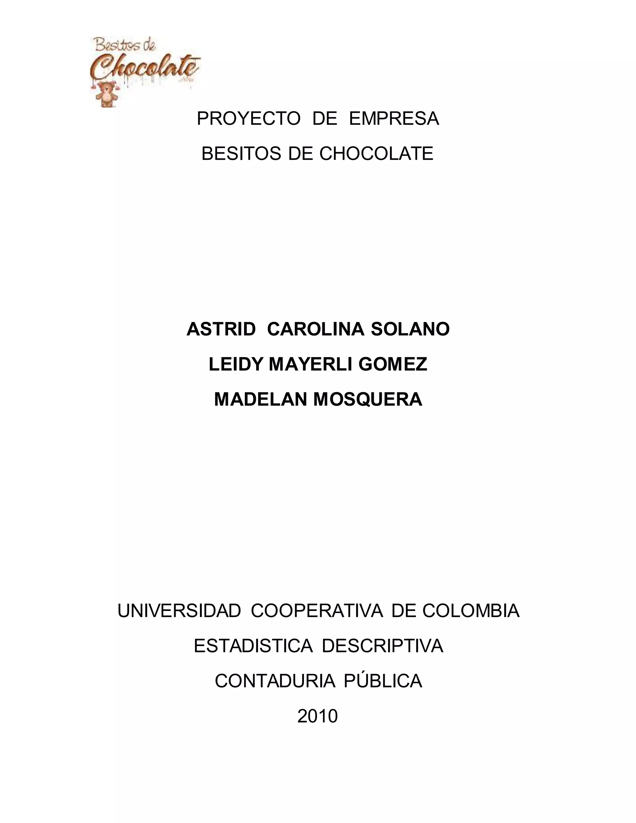 El documento presenta un proyecto de empresa de chocolates llamada Besitos de Chocolate. Describe el planteamiento del problema, los objetivos generales y específicos de la empresa, así como información sobre el chocolate, la historia del cacao, y las estrategias, políticas y metodología del proyecto empresarial.